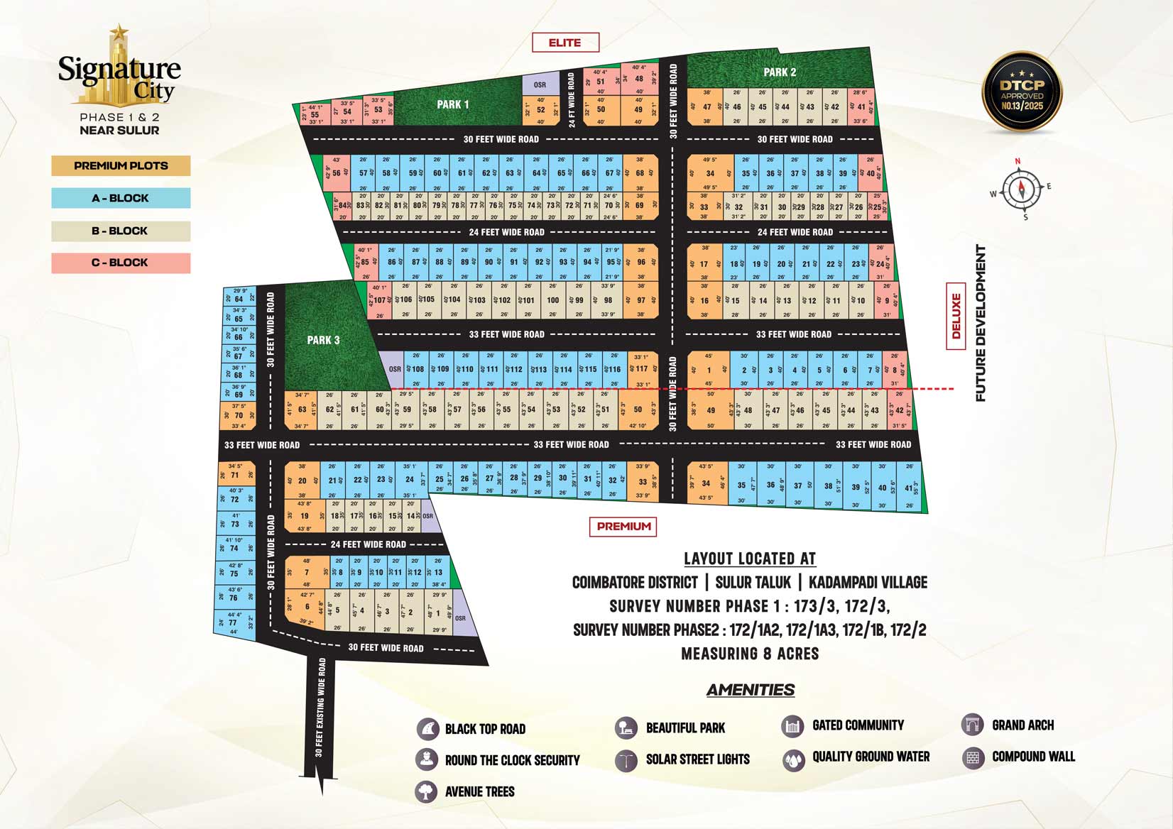 Signature City, Sulur is thoughtfully designed across 8 acres of lush greenery and features 194 premium DTCP-approved plots ranging from 600 sq.ft. to 2035 sq.ft.. The layout is perfect for those seeking DTCP plots for sale in Sulur that offer the rare combination of tranquility and urban convenience. With easy access to major roads, educational institutions, and shopping hubs, this is the perfect place to build your luxury villa.
